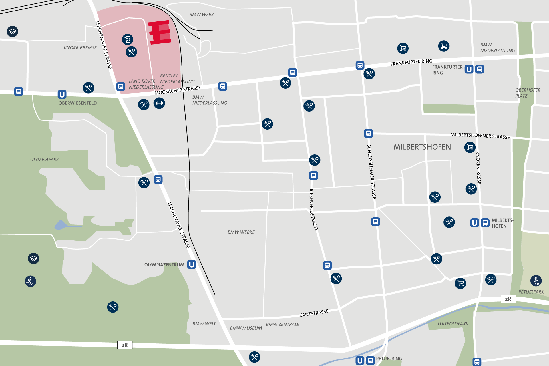 Milbertshofen zählt zu Münchens dynamischsten Wirtschaftsquartieren. Das gewerbestarke Umfeld von MINDS ist geprägt von globalen Unternehmen wie BMW und Knorr Bremse, innovativen Mittelständlern und kreativen Start-ups. Die optimale Verkehrsanbindung mit U-Bahn, Buslinien und direkter Nähe zum Mittleren Ring macht den Standort schnell erreichbar, sowohl aus der Innenstadt als auch aus dem gesamten Großraum München.