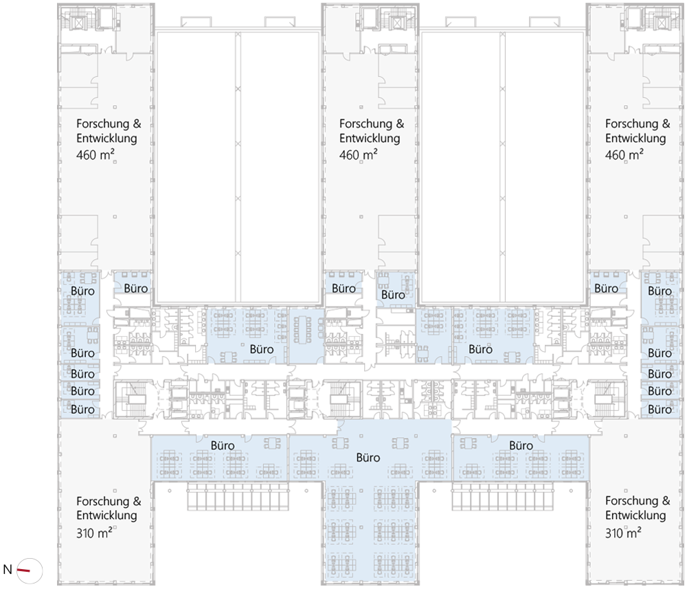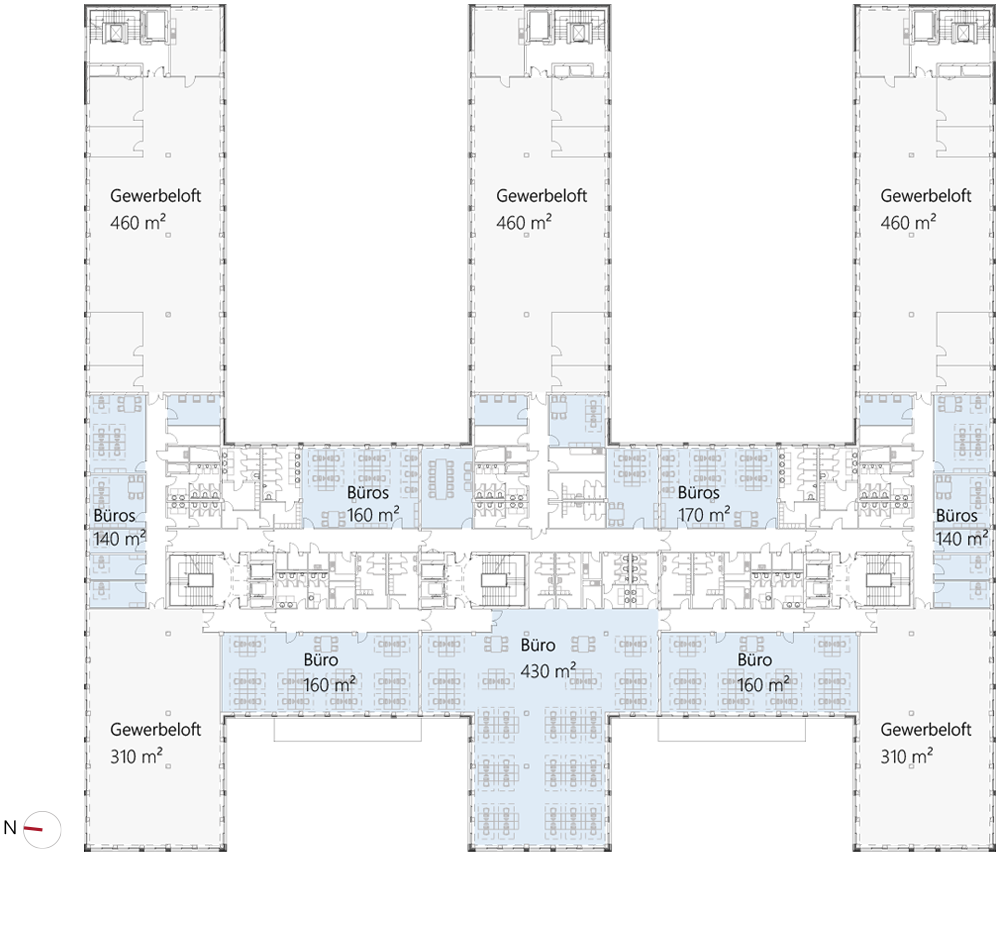 Variable Grundrisse im MINDS ermöglichen eine passgenaue Gestaltung – von der funktionalen Werkhalle und Ausstellungsflächen im Erdgeschoss bis zu modernen, kombinierten Büro- und Werkstatt- oder Laborflächen in den oberen Geschossen. Hier sehen Sie drei Beispiele, wie die Grundrisse im Obergeschoss gestaltet werden können: